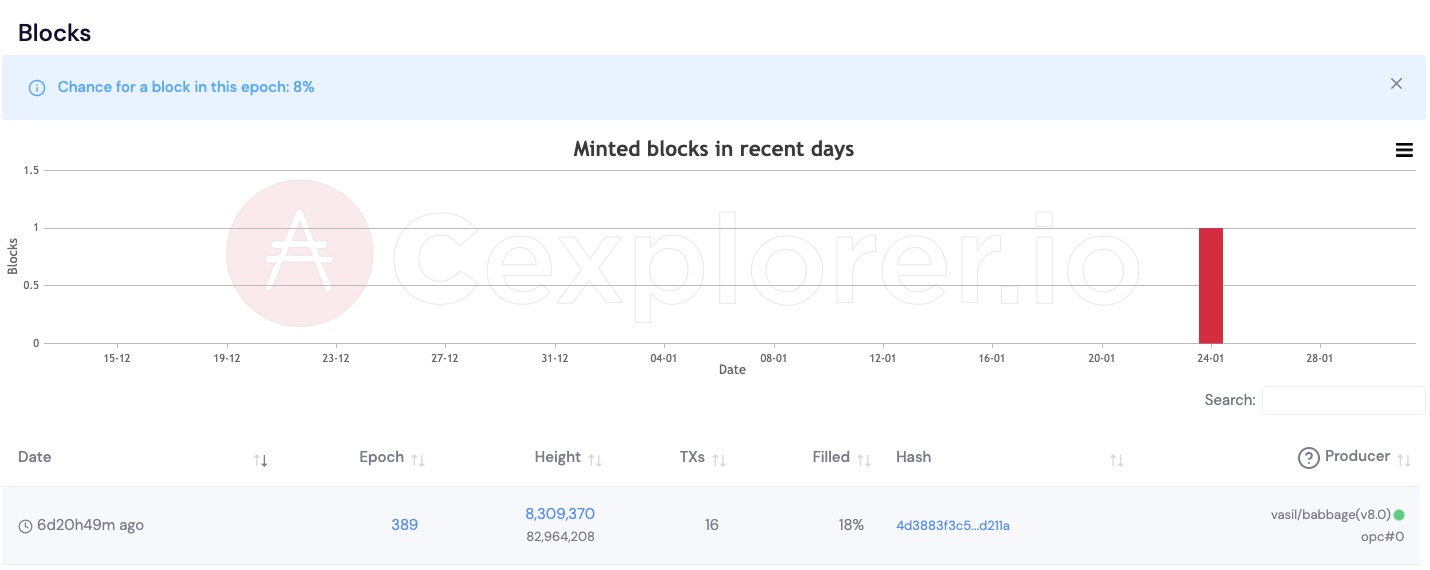 Ce n’est pas grand chose, mais cela montre que mon Stake Pool est fonctionnel à 100% (VRK Key, certificat, relays etc…), et que même les très petits pools comme le mien, peuvent parfois être sélectionnés pour valider des blocs 🙂